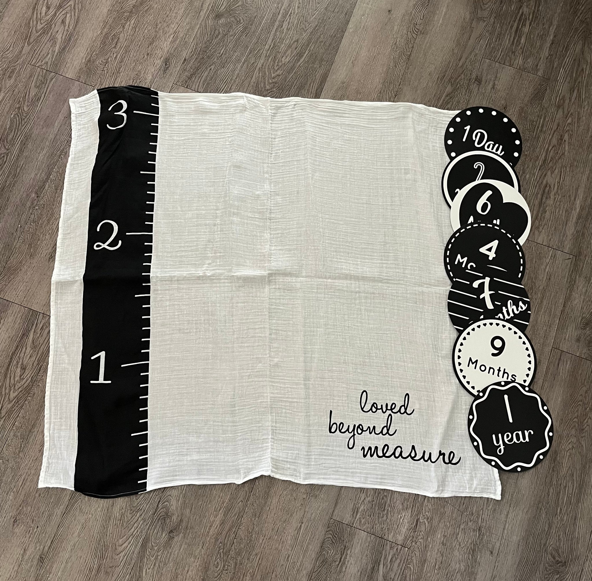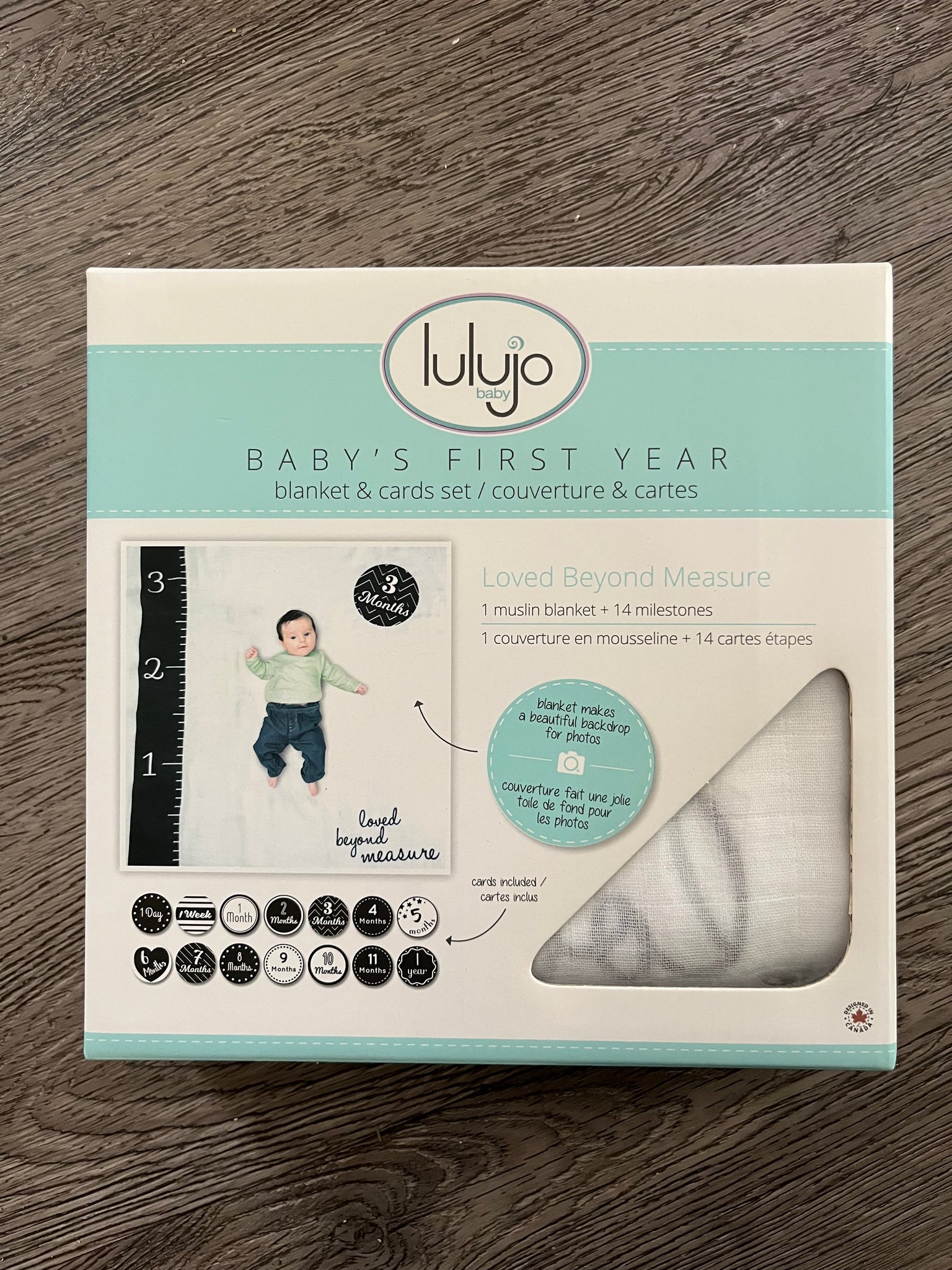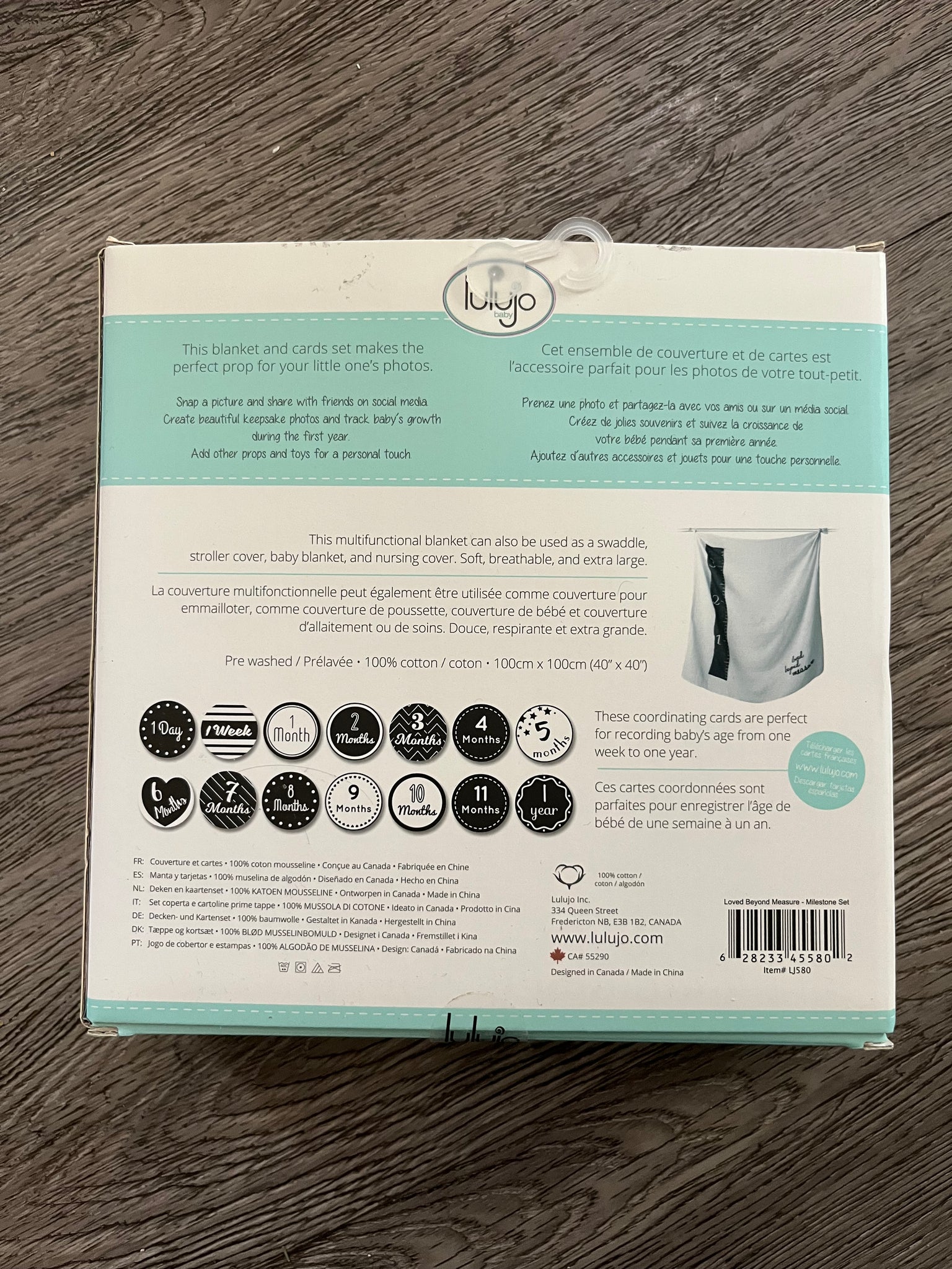Lulujo "Baby's First Year' blanket & card set for photo documenting of baby's first year of development, black & white 100% cotton blanket, black & white coordinating cards for recording baby's age from 1 week to 1 year, machine washable blanket and wipeable coated cards.