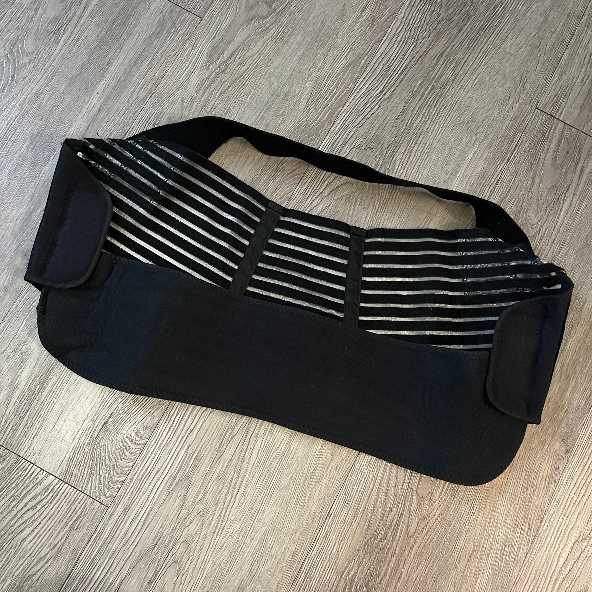 Babies-R-Us maternity support, black, comes with abdominal support pad, belly belt wrap with velcro closure, upper tummy strap, all adjustable and hook+loop closures, expandable to grow with your belly, provides gentle yet firm support, eases pain in back,legs and abdomen, fits comfortably under clothing. Condition note: wearing / fading.