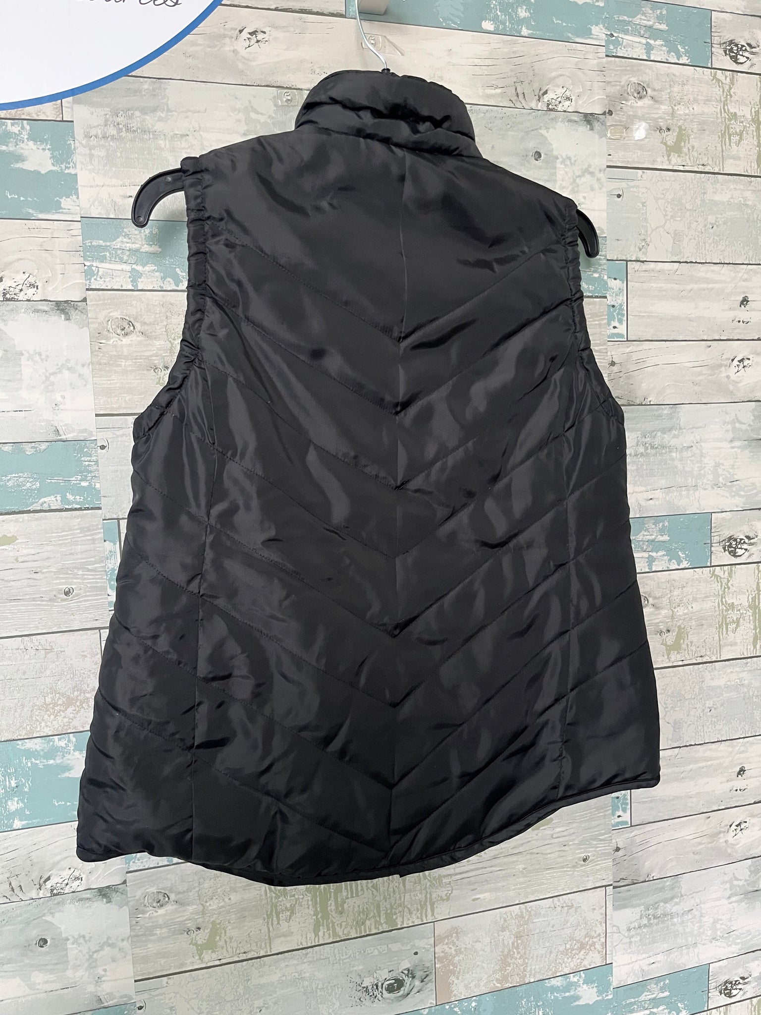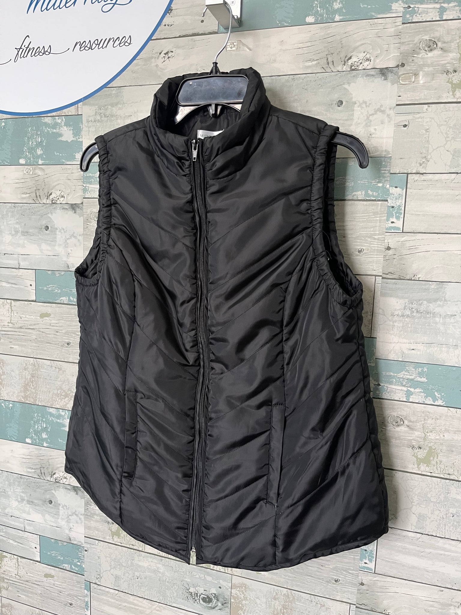 Motherhood Maternity Vest: black, cushion quilted puff, zippers down, functional side pockets.