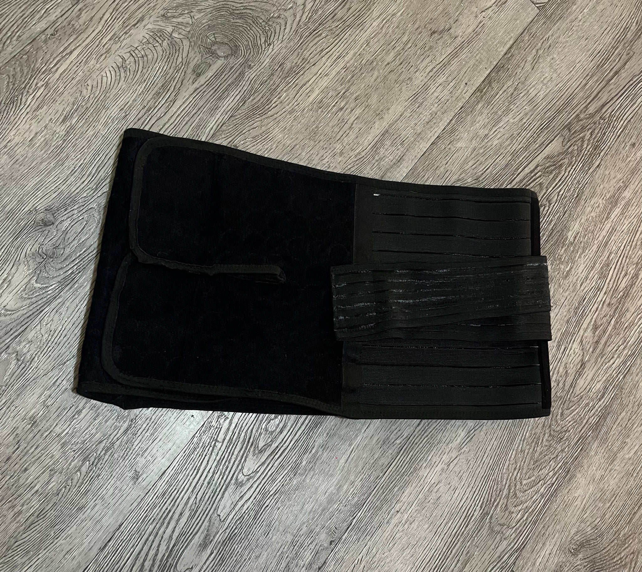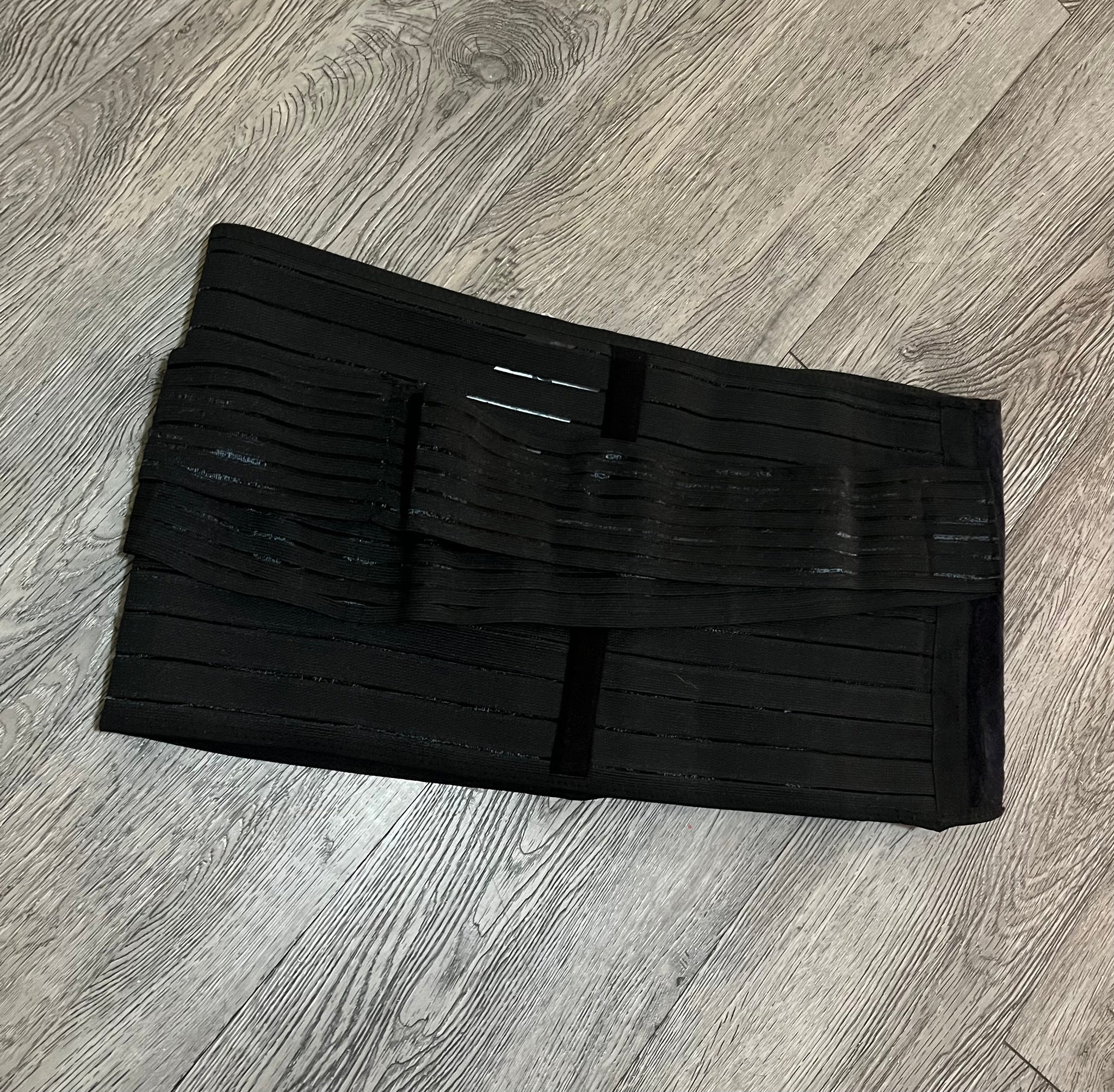 Chong Erfel postpartum recovery band, black, adjustable velcro on belly with plush layer in interior, back boning, additional velcro adjustments from back to front of hips for pelvis support, plus sized. Condition note: some wearing on the velcro trim.