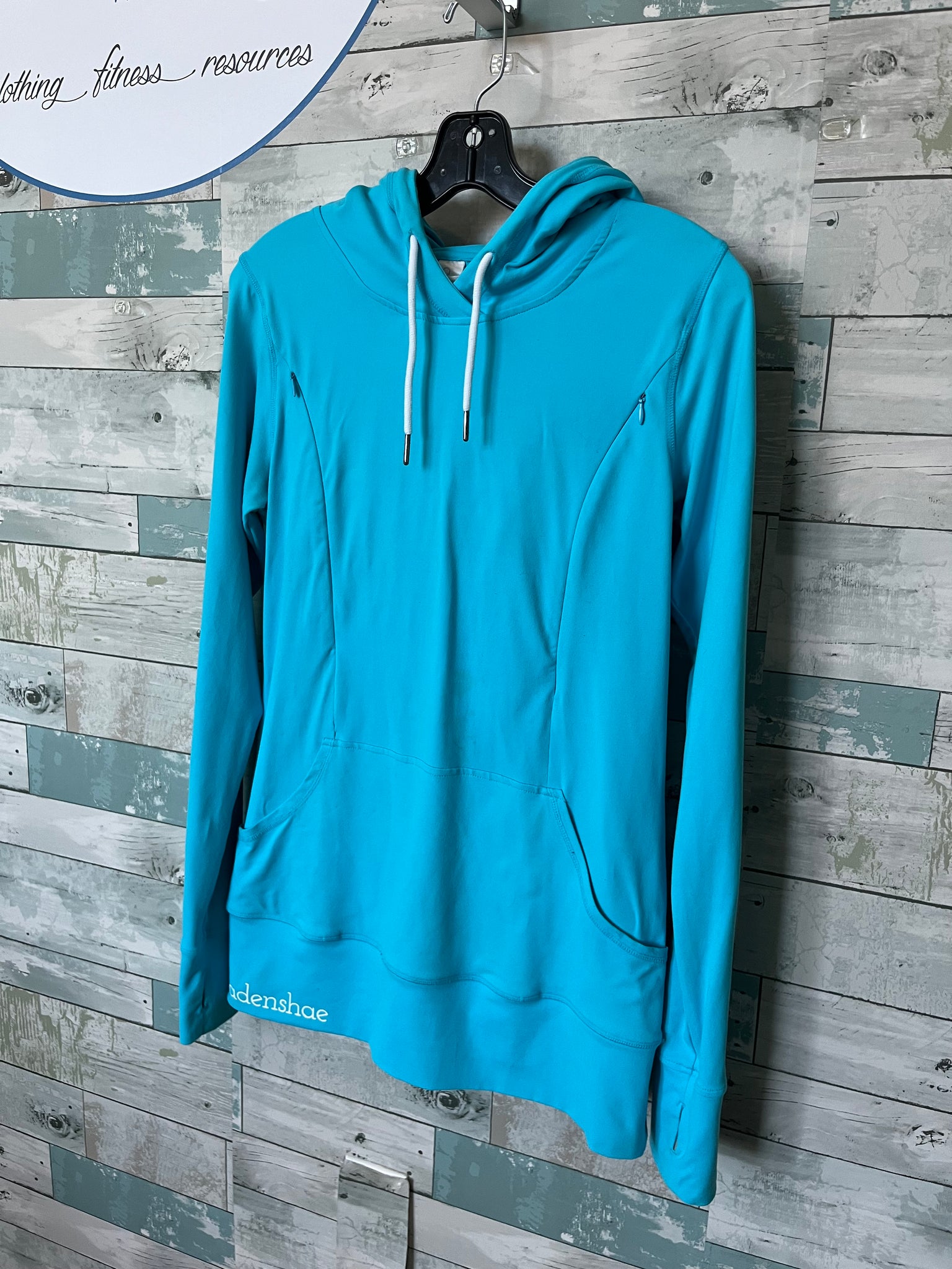 Cadenshae nursing hoodie, bright blue, hood with white drawstrings and silver-black hardware, two vertical invisible zippers on chest for nursing access, long sleeves with thumb holes, kangaroo pocket on front, long through torso with wide hemline, white screenprint "Cadenshae" along botton right thigh.