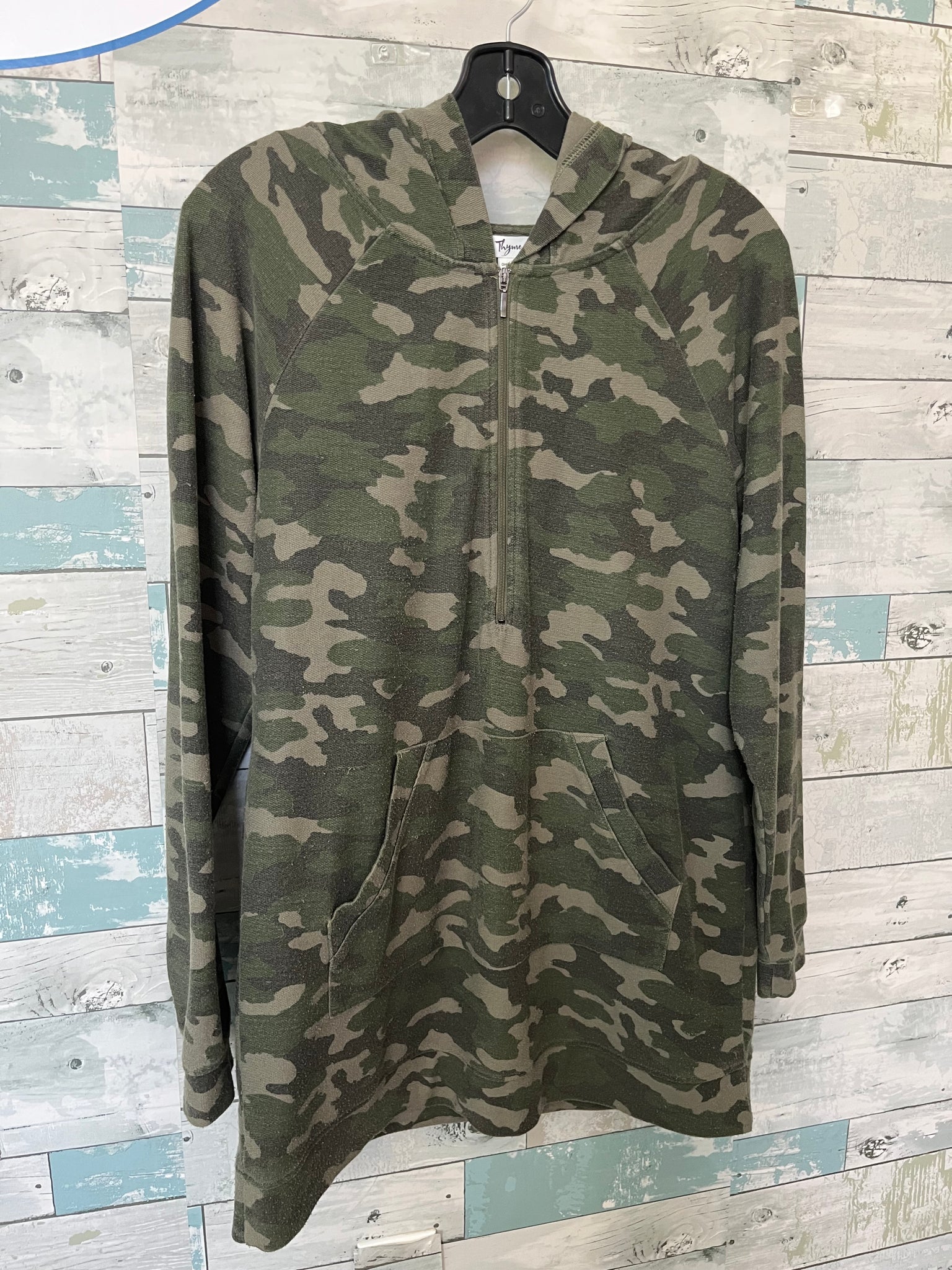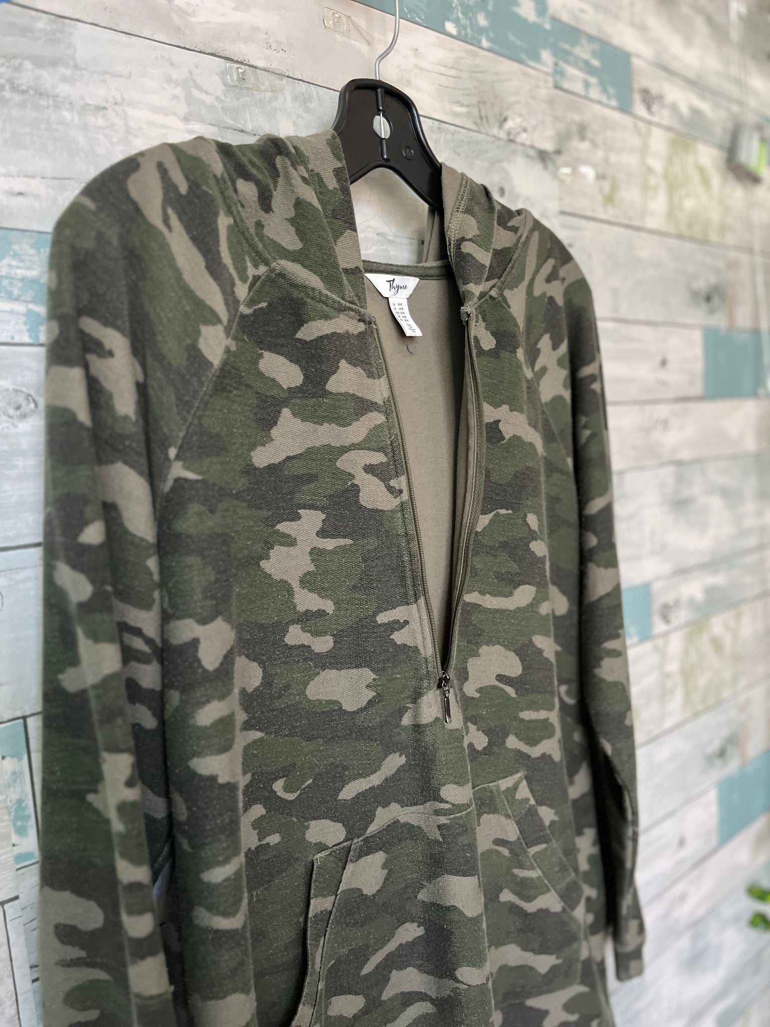 Thyme Maternity nursing top, green camoflauge, hood, functional zipper down chest for nursing access, full length sleeves, functional kangaroo pocket at front, long torso length. Condition note: faint pilling throughout.
