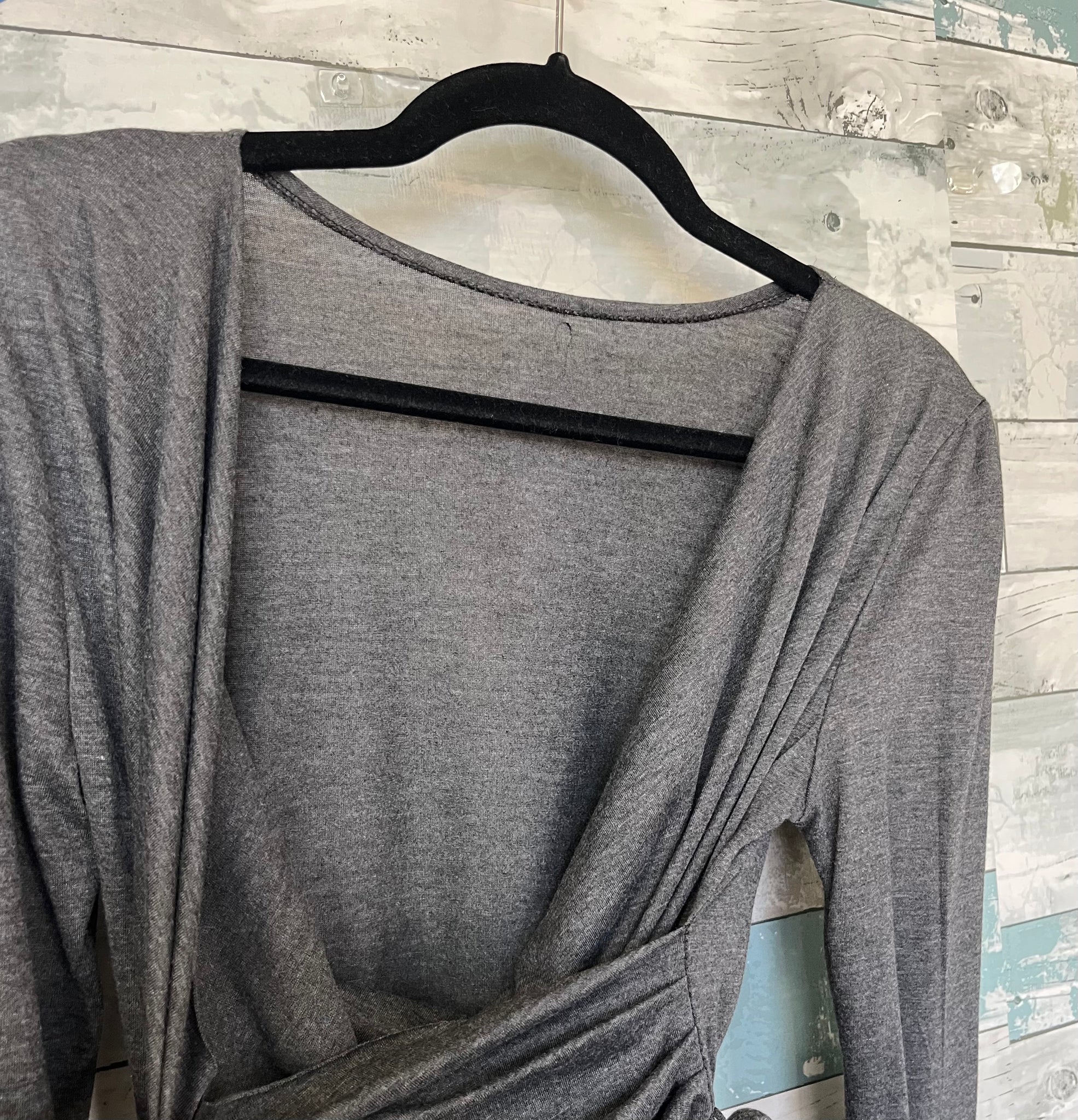 Nursing princess faux-wrap around dress, charcoal grey, deep-v neckline with criss-cross panels for nursing access, long sleeves, seam around waistline, long sewn-in fabric belt to tie up as desired around waistline, dress hem lands at knees or just below.