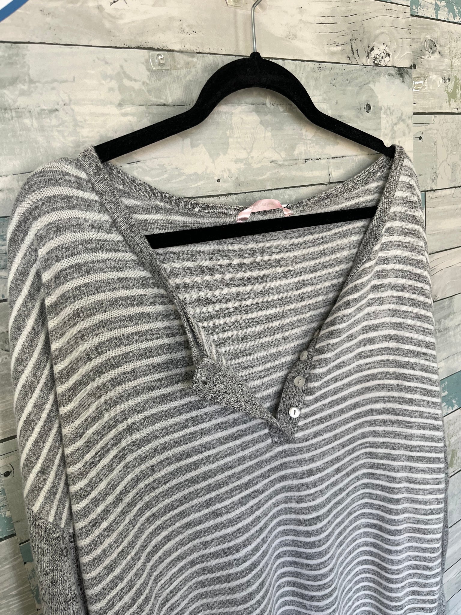 La Vie En Rose sweater-knit loungewear, light gray and white horizontal stripes, 3/4 length heather-grey sleeves, round neckline with 5x button down panel, back top of nighty has sewn on engraved metal tag " La Vie En Lounge", hemline lands below knees. *nursing access through button opening at chestline.