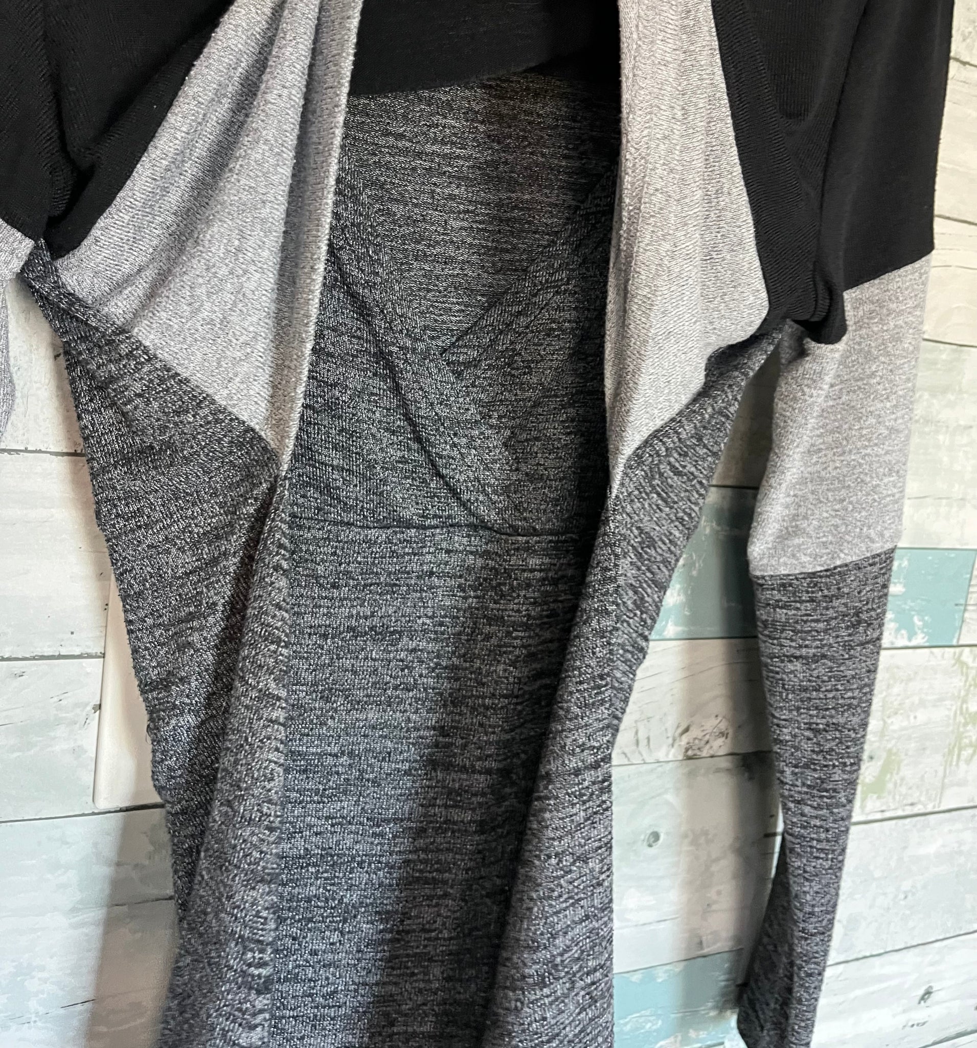 Bearsland double layer nursing top, vertical block style top (Black, light heathered grey and dark heathered grey, scoop neckline, long sleeved, horizontal panel lifts for nursing access.