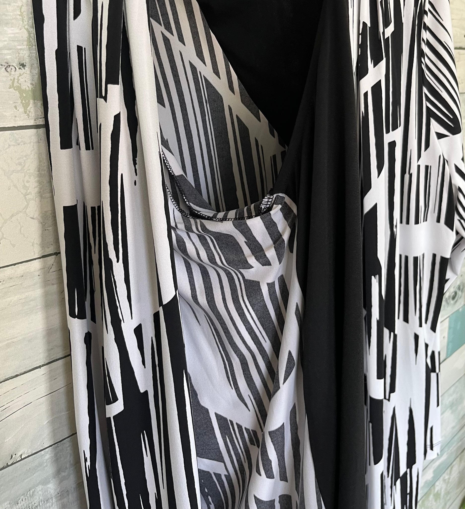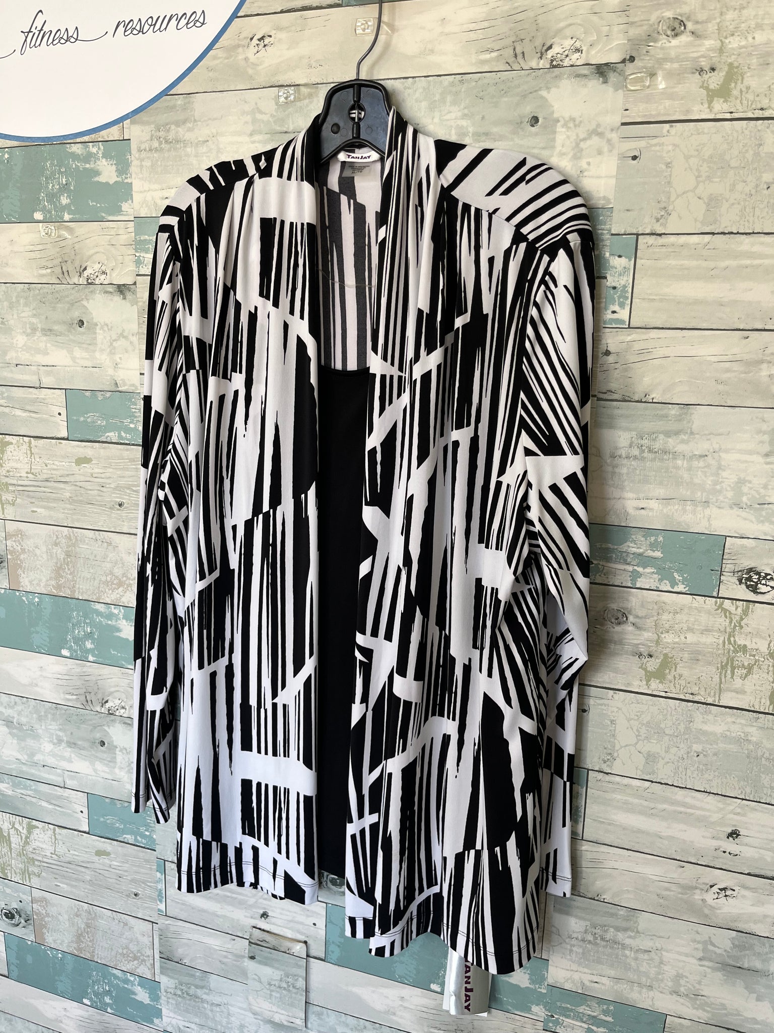 Tanjay nursing Cardigan with built-in sleeveless top, black and white abstract design, black tank, open front cardigan with foldable mock-collar going down both sides of cardigan front, scoop neckline tank top panel, long sleeved, pleated front shoulder panels on cardigan, dressy style top, brand style: Missy. NWT.