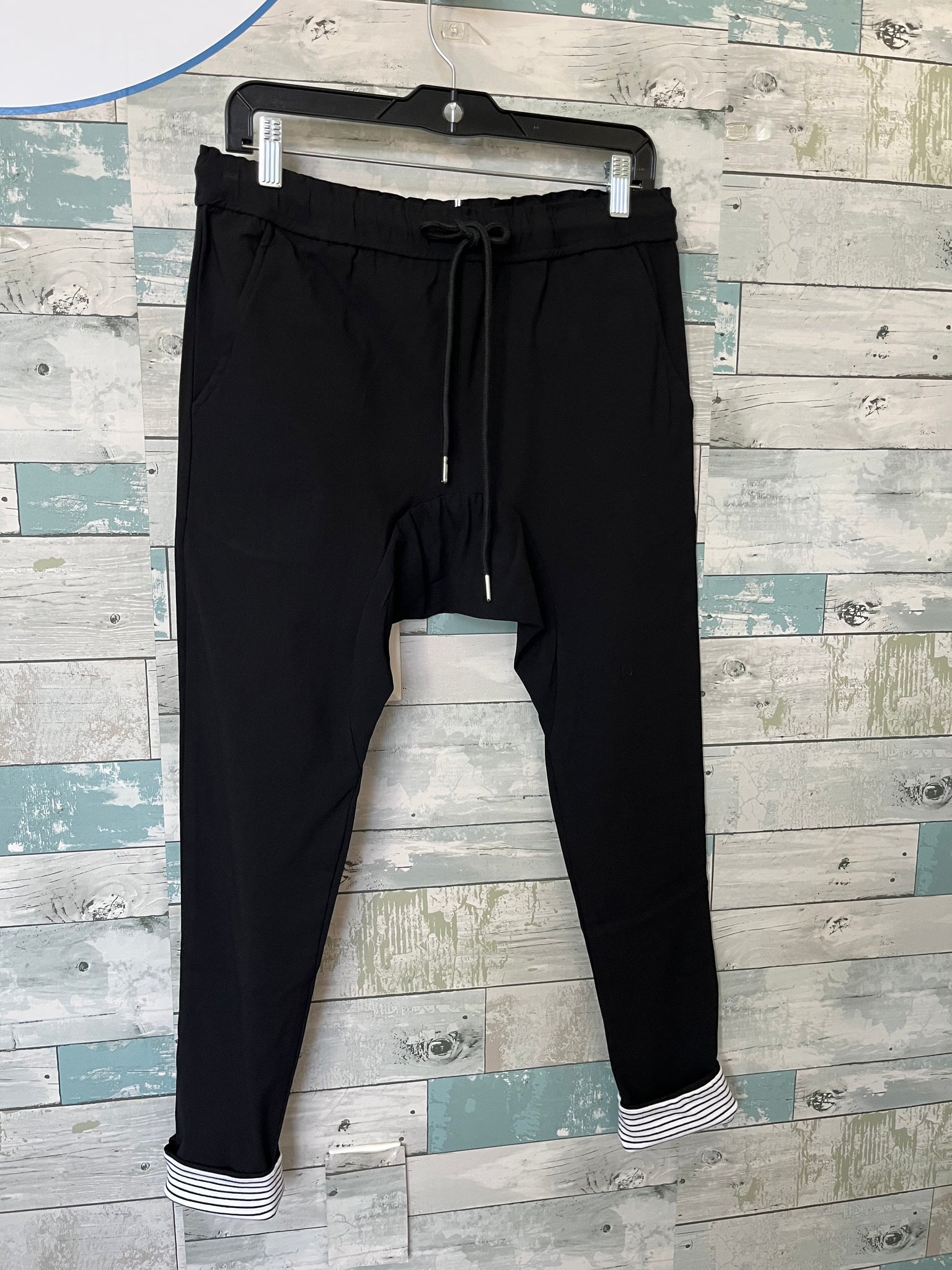 Legoe Heritage maternity boston twill pants, black, paper bag waist band designed to sit under the bump/low on the hips, black rope drawcord with silver toggle ends, functional diagonal slit front pockets, faux flap panels on back, drop crotch style, relaxed fit up top that flows into a skinny leg, striped white/black ankle cuffs(only visible when folded up),stretchy mid weight cotton twill. NWT. Original retail price: $42.30 CAD. Size:2