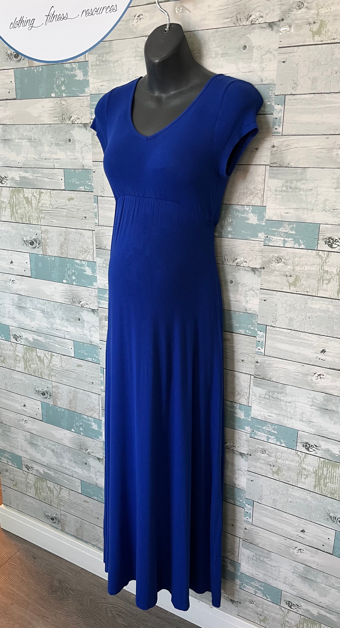 Planet Motherhood maxi-dress: cobalt blue, v-neckline, capped sleeves, empire waist with elastic stretch, removable pink / grey / white corded tie with silver hardware, full length, soft jersey fabric. Condition note: faint pilling throughout.