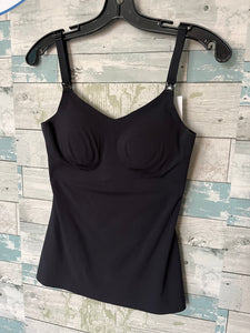 Knix "Revolution" style nursing tank top, black, adjustable spaghetti straps with clasps for nursing access, built-in wireless shelf bra with removable padding, seamless design, stretchy nylon/spandex/polyester blend fabric.