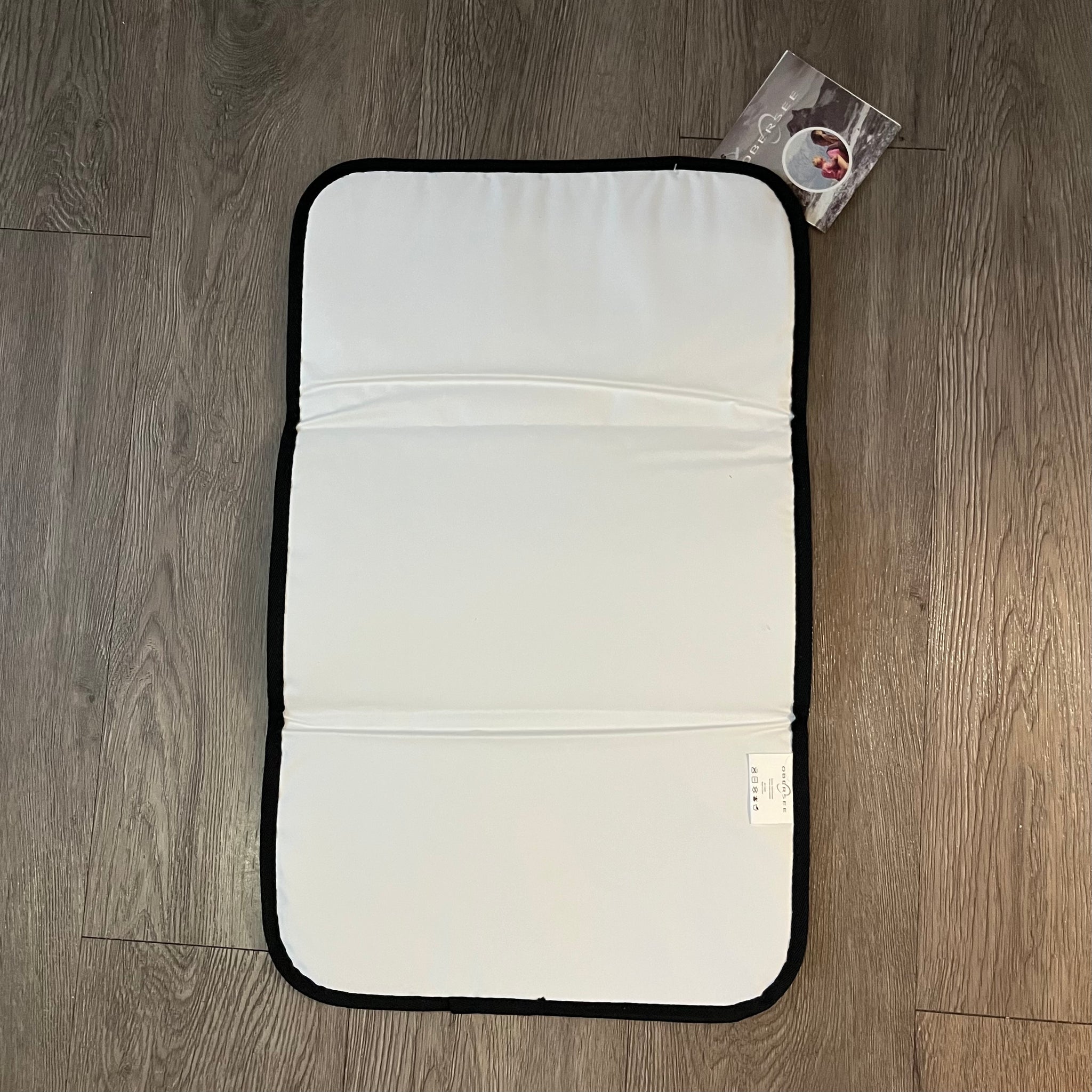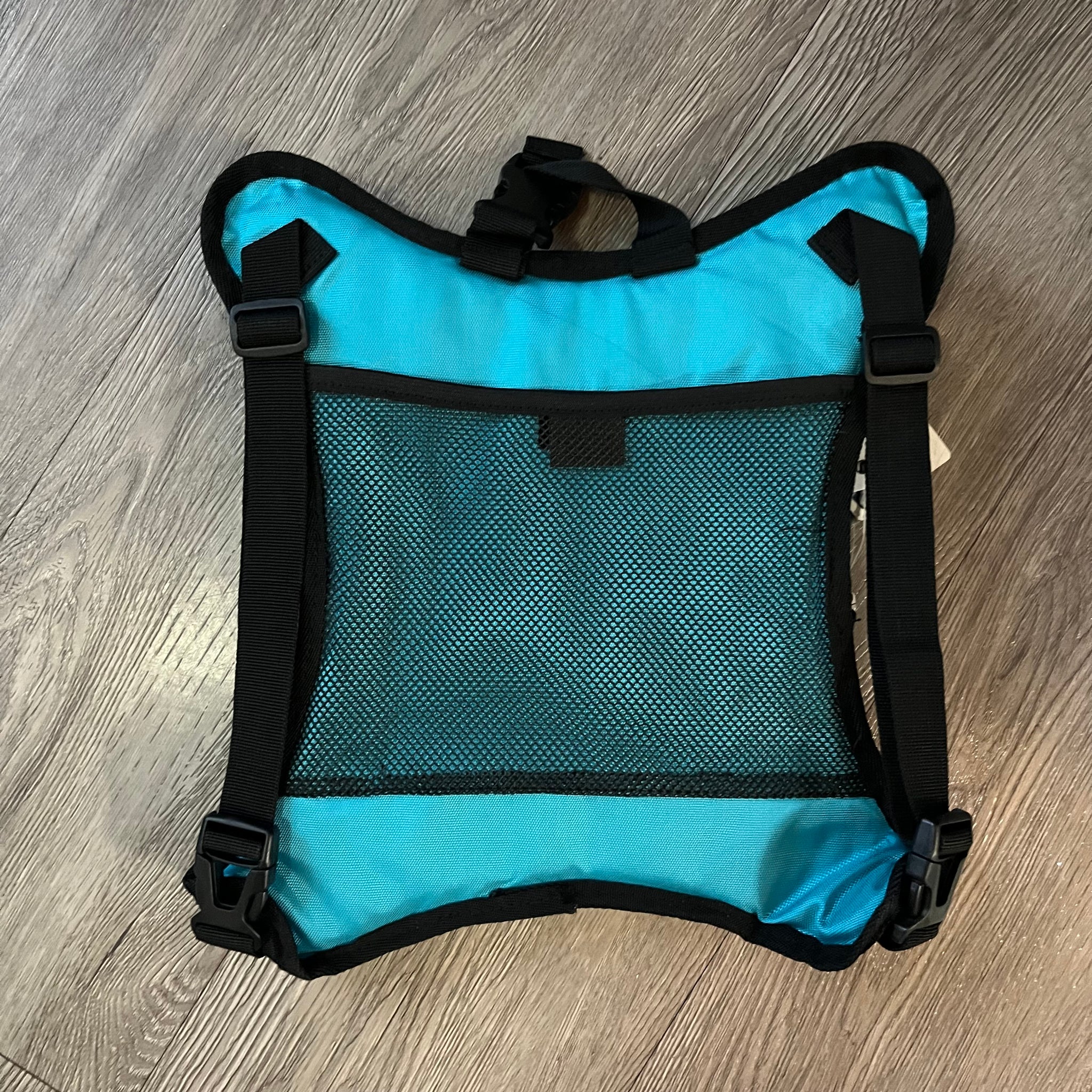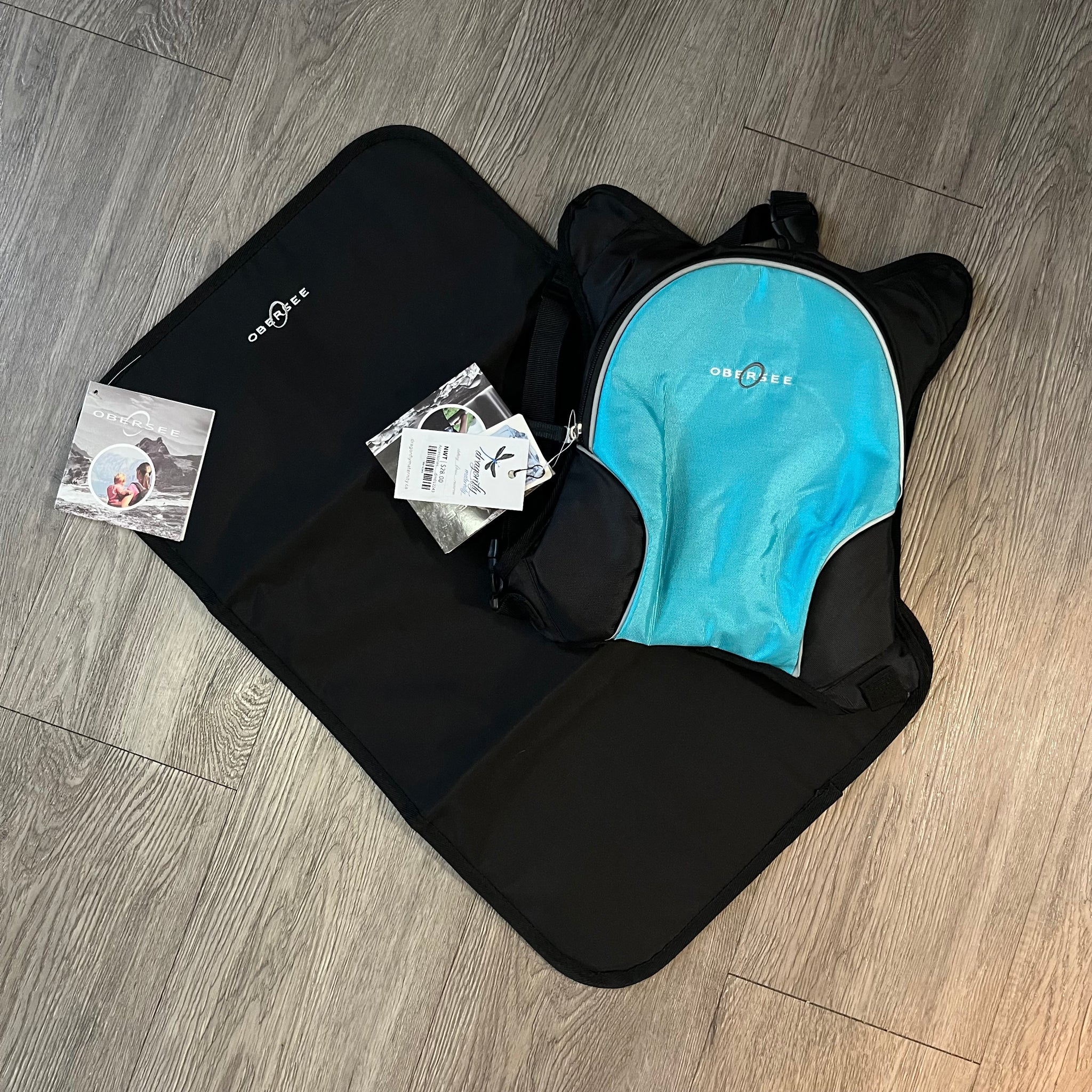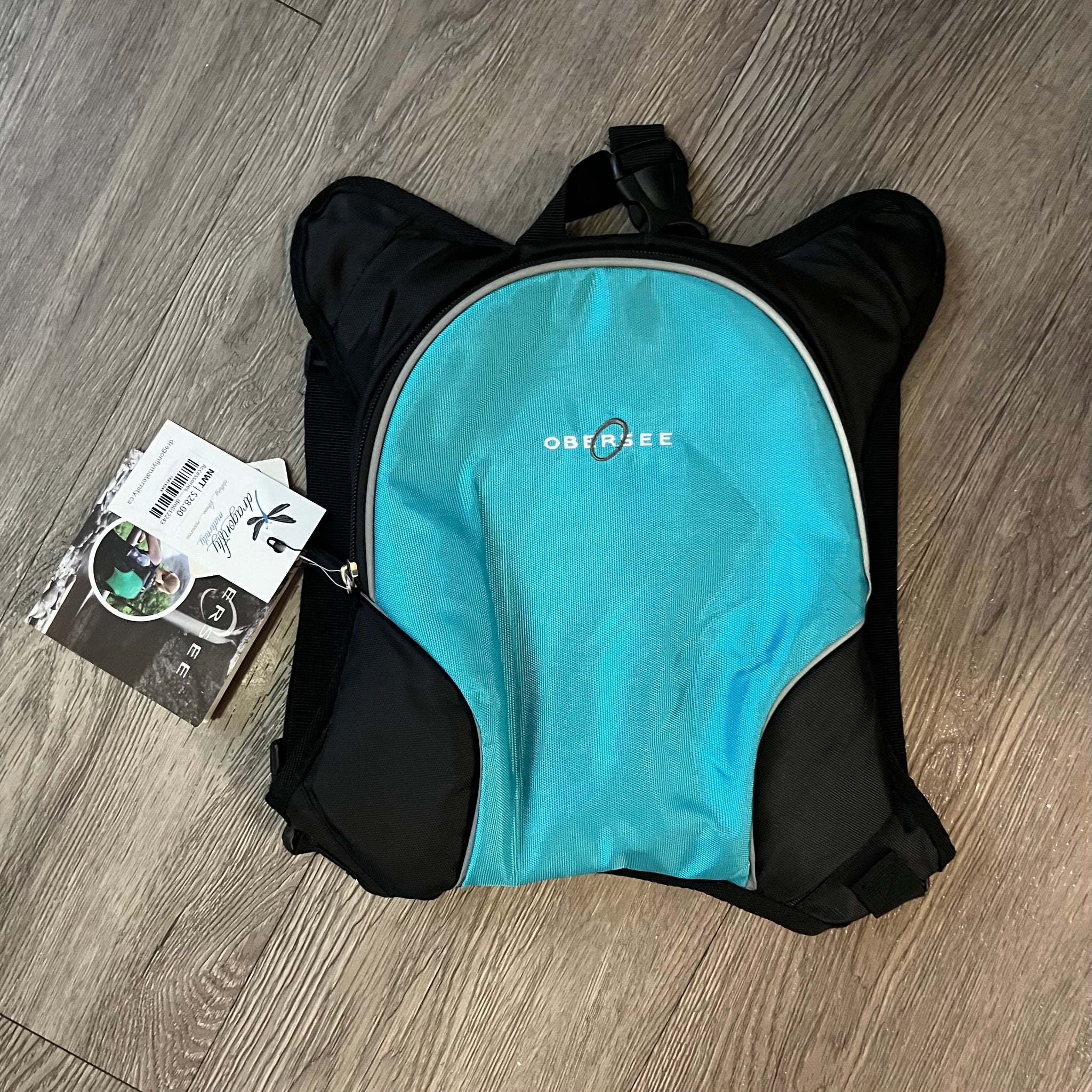 Obersee mini diaper bag / cooler, black with teal panel, zipper on main compartment, interior is insulated wipable cooler compartment, top carrying handle, adjustable shoulder straps with clips at bottom, mesh pocket at back, comes with diaper change pad.