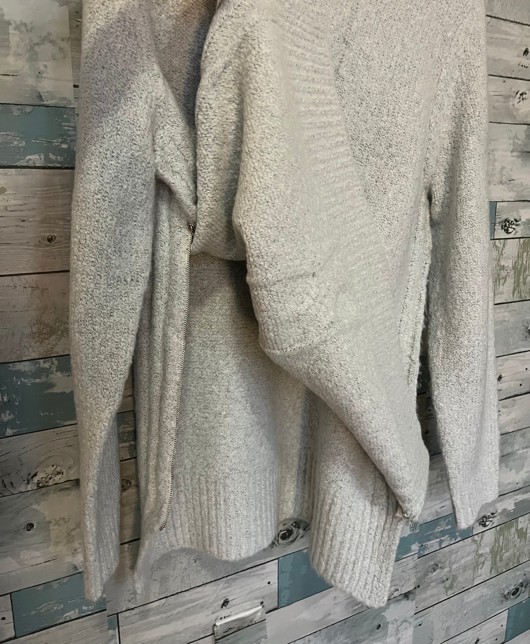 Ripe nursing sweater, "Snow" heather grey/white blend, thick cable-knit, rounded mock-neck with ribbed pattern, long sleeves with ribbed cuffs, functional side zippers for nursing access, soft and cozy relaxed fit. NWT. Original retail price $141.00 CAD *Care note: Dry Clean or Hand wash/lay to dry.