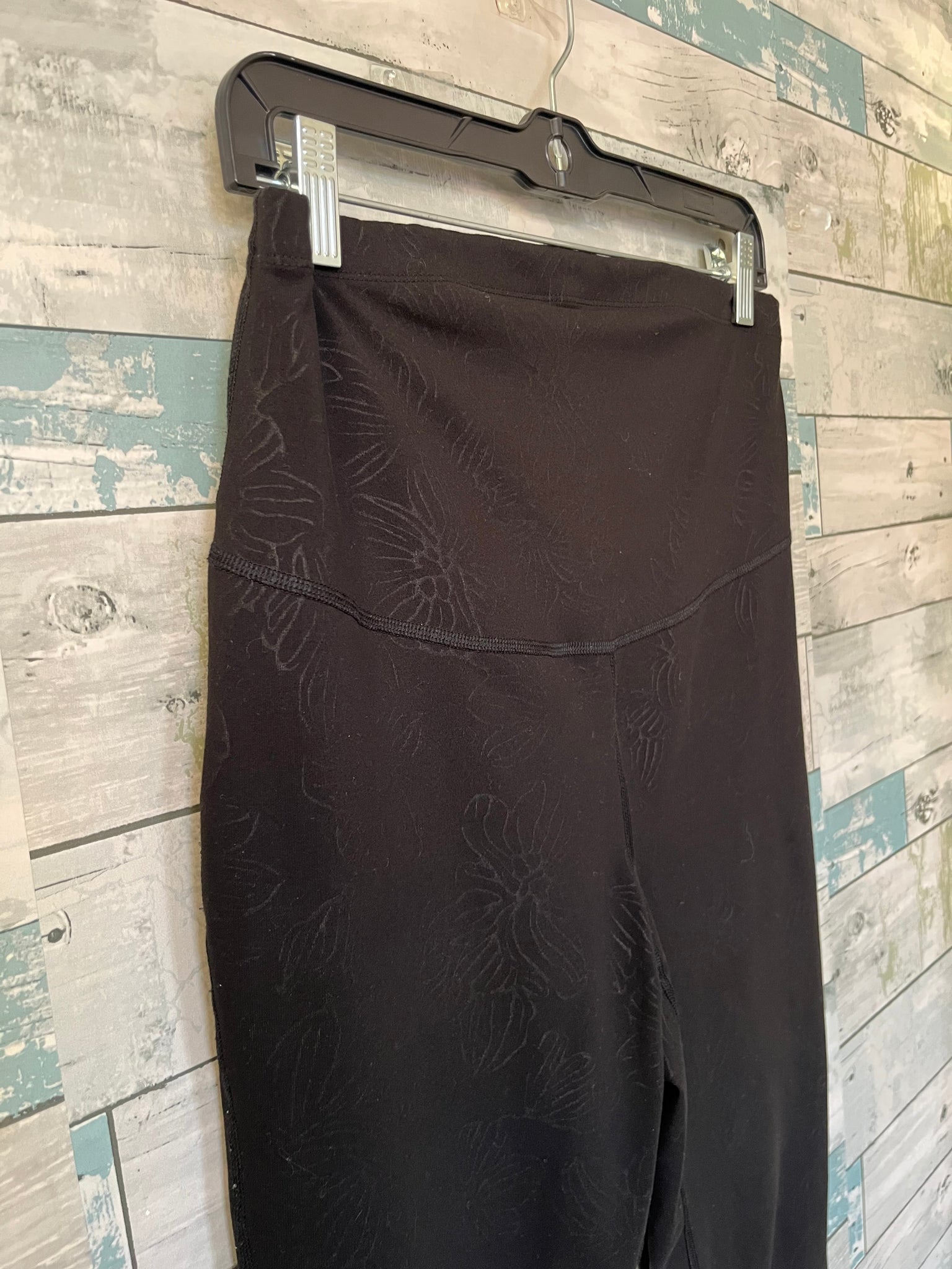 Old Navy maternity legging, black with subtle floral print, full panel stretch waist, full length skinny, active wear, fast dry fabric.