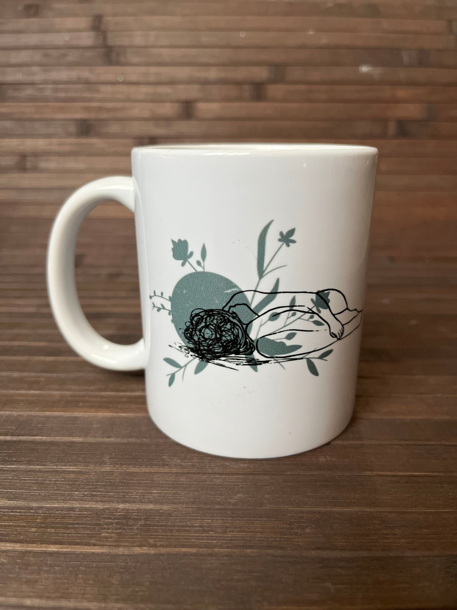 Perinatal Mental Health Matters ceramic mug, white with black text and floral graphic.