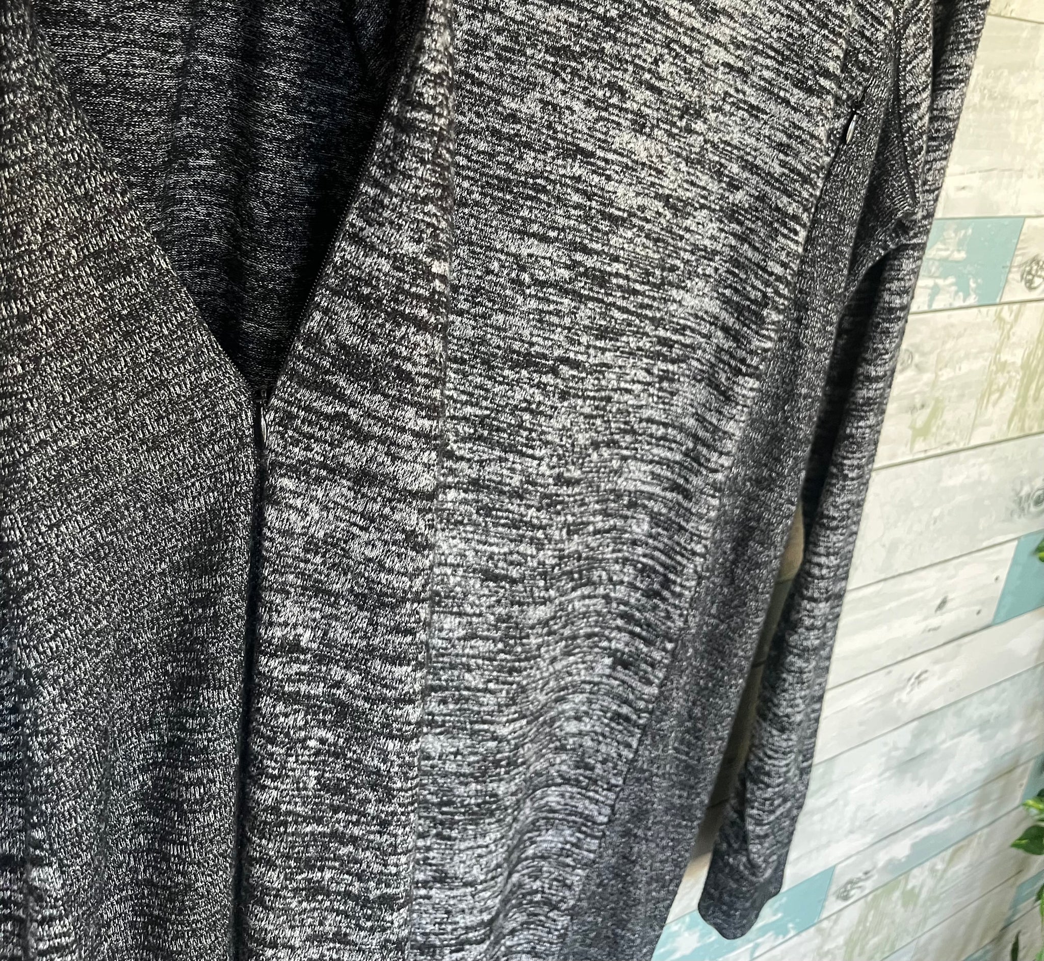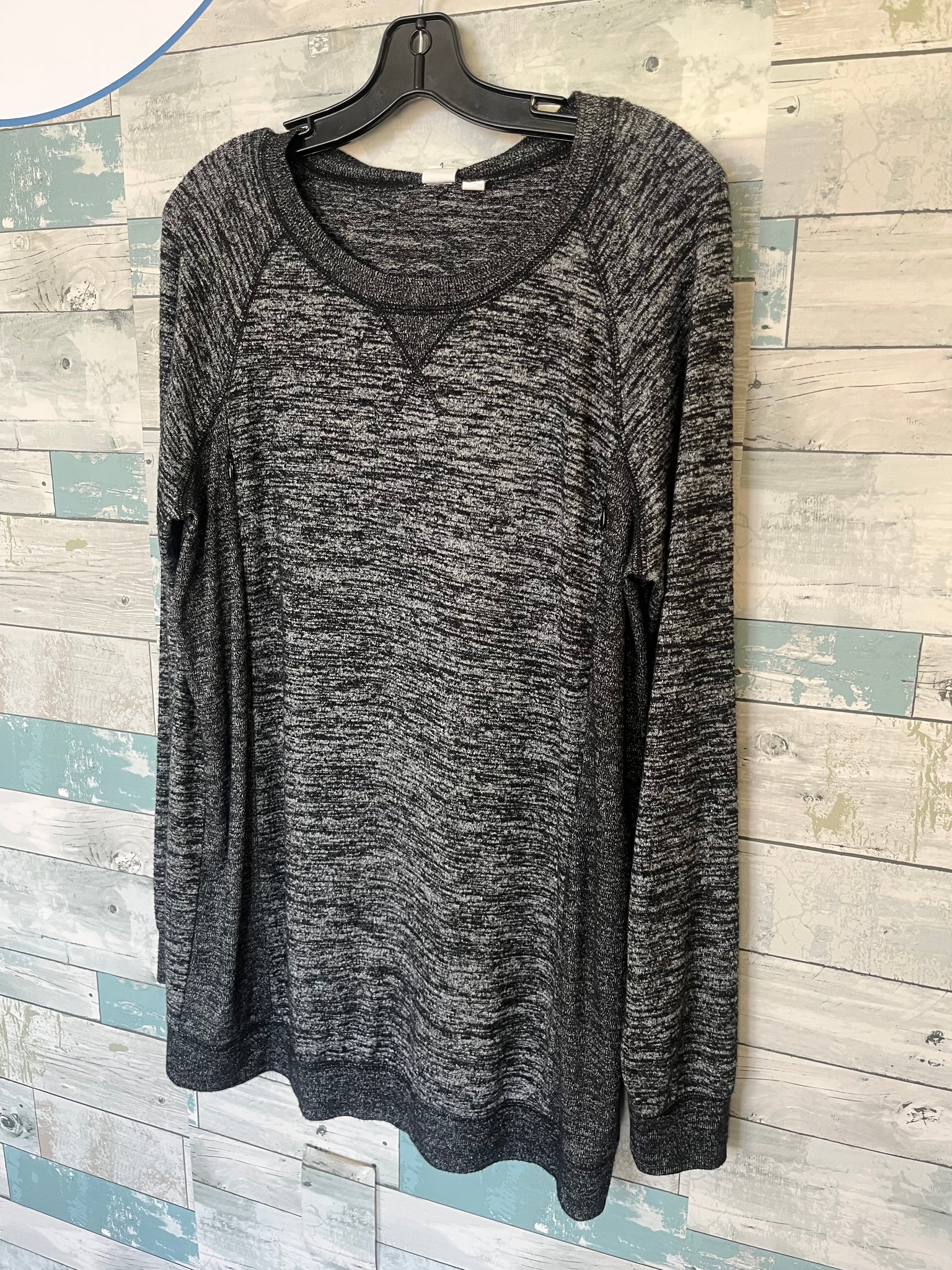 Gap Maternity nursing sweater, heathered dark grey / black, scoop neckline, long sleeves, invisible zippers on sides for nursing access, long torso length.