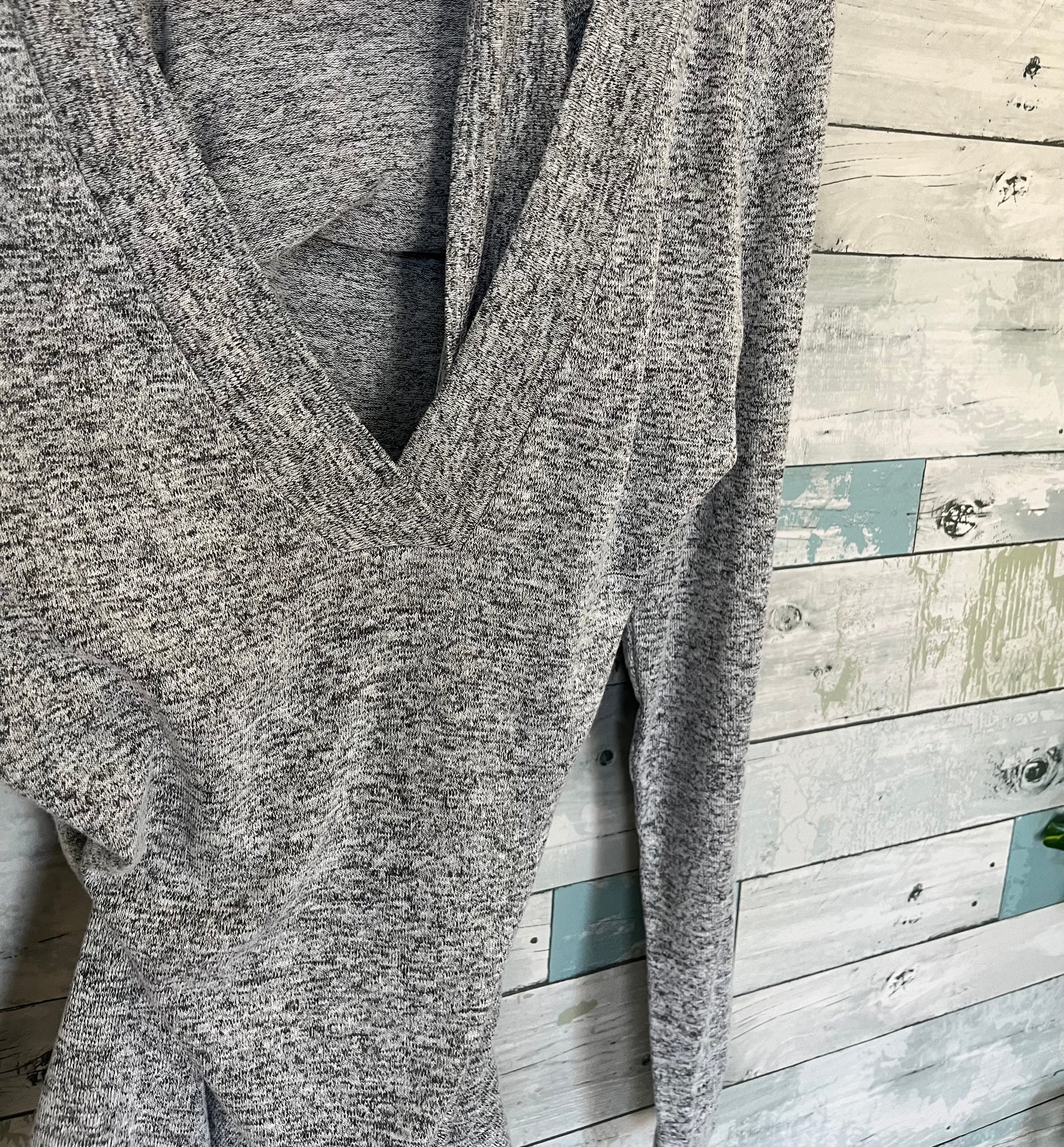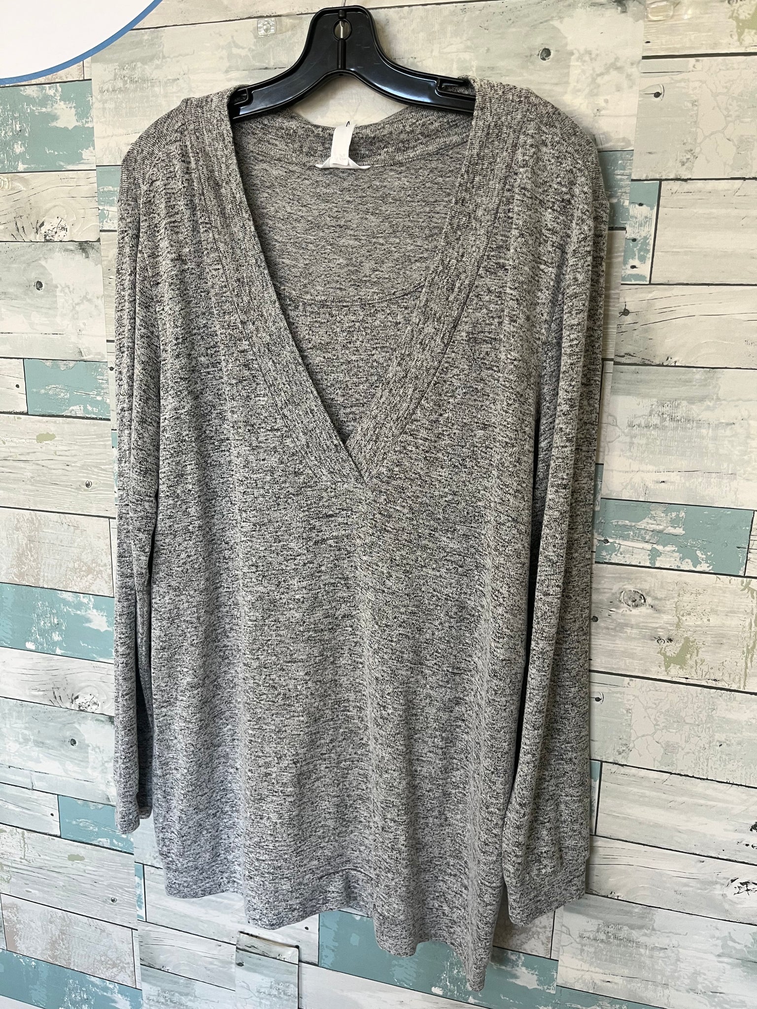 Thyme Nursing top, heathered light gray, knitted sweater fabric, long sleeved, v-neck with scoop neck underlayer which lifts for nursing access.