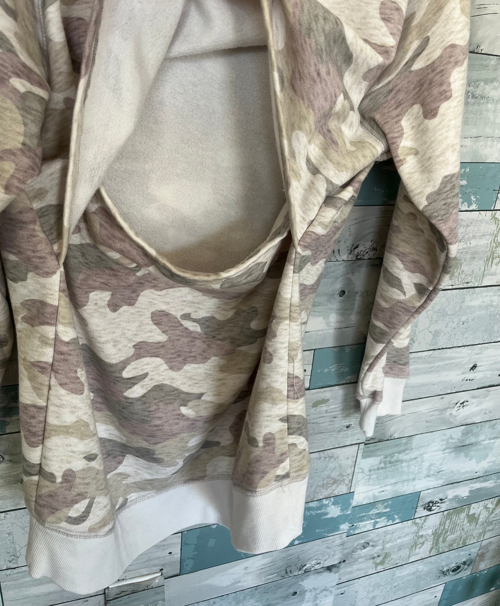 Old Navy Nursing Sweatshirt, light beige / brown / grey camoflauge pattern, slight heathering to fabric, crew neckline, long sleeved, fleece lining, split under bust for nursing access.