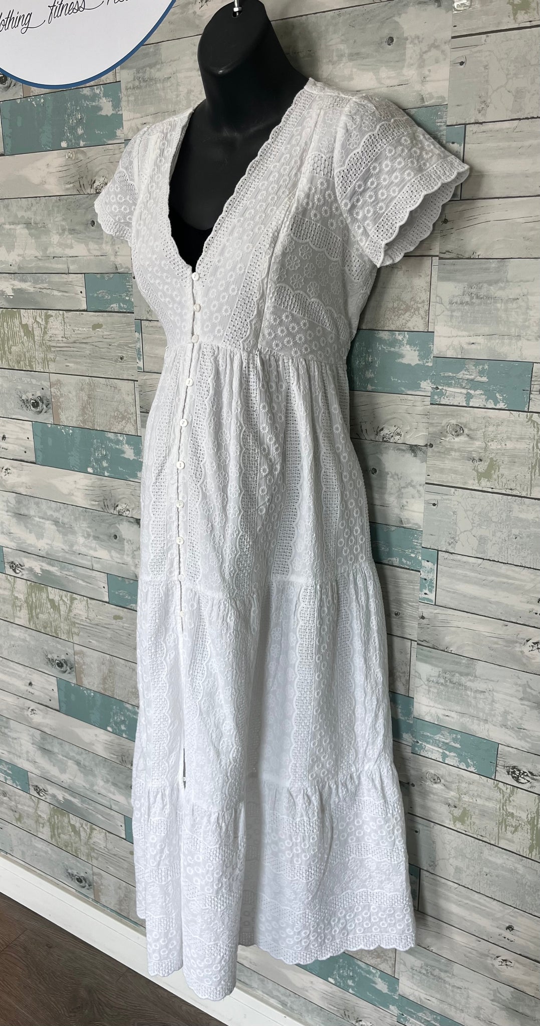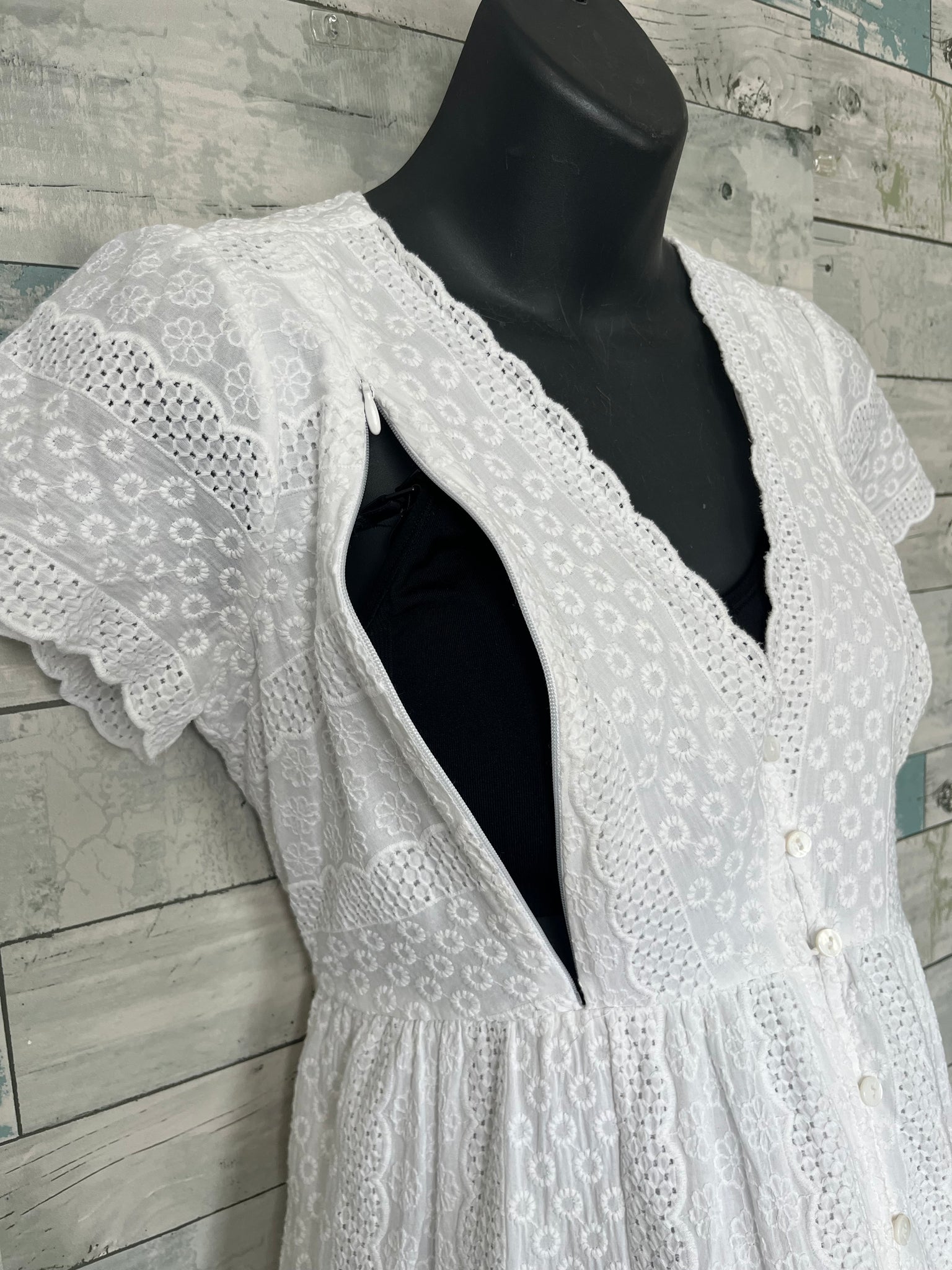 Seraphine Nursing Dress, white eyelet lace, with fitting underlining, v neckline that buttons down to bottom of skirt, short sleeved, two zippers on chest to offer accessible nursing, includes tie to the waist, countryside fashion, tea length gown, made out of 100% cotton.