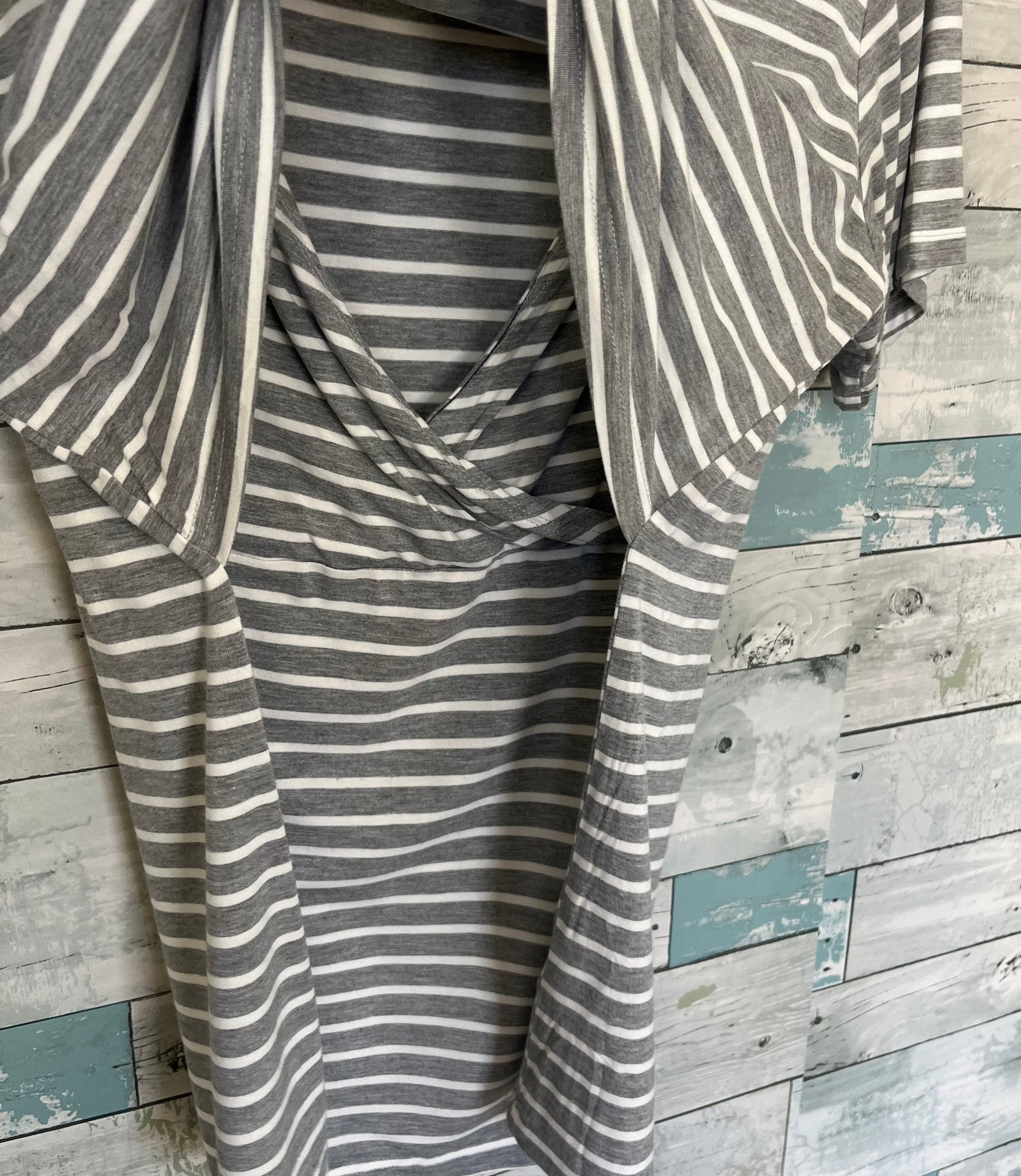 Small Show Nursing T shirt, gray with white horizontal stripes, short sleeved, boat neckline, soft jersey fabric, split under bust for nursing access, basics/casual wear staple.