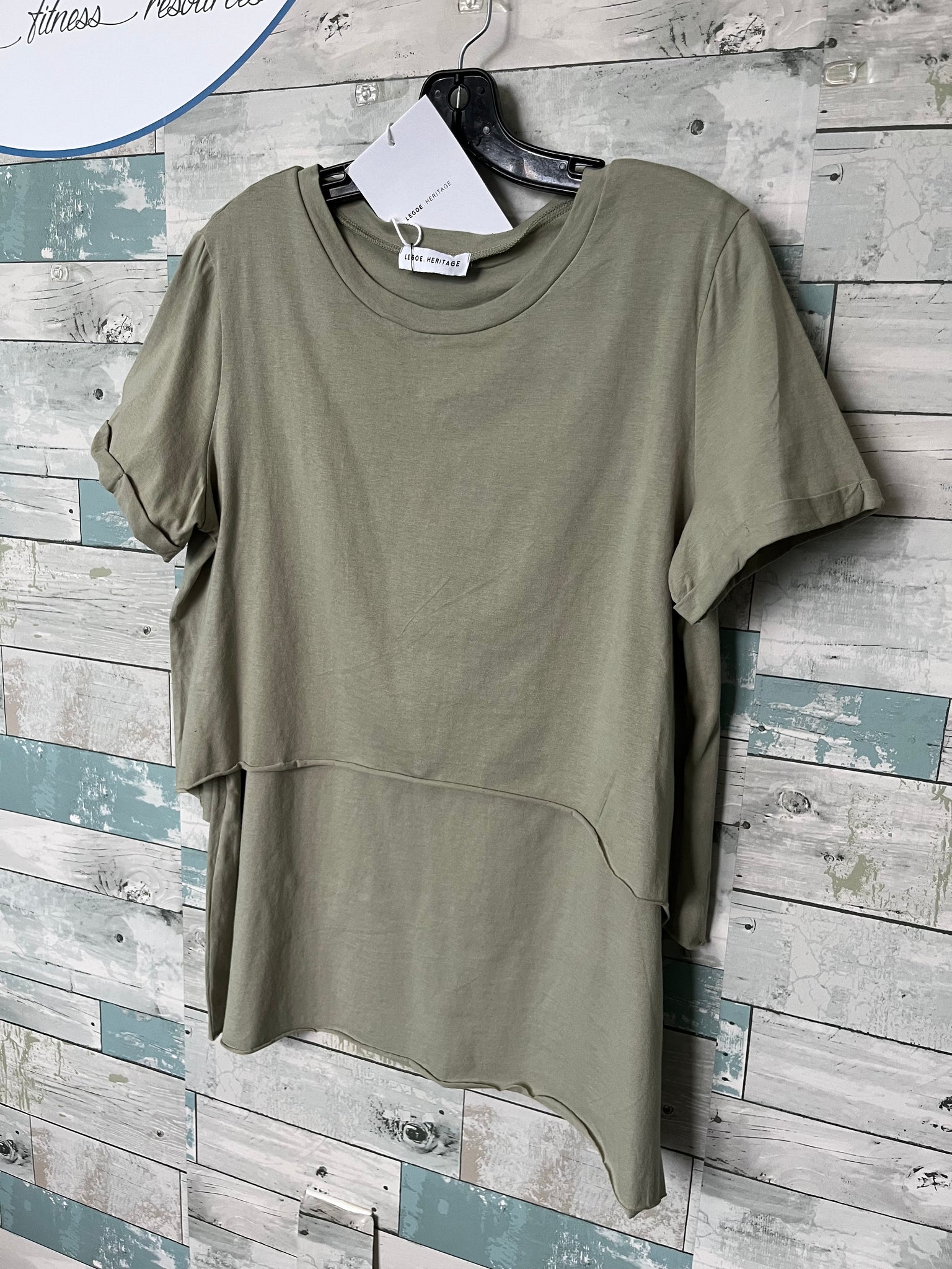 Legoe Heritage valance nursing tee, light olive green, short sleeved, sporty crew-neck, double layer, top layer curved front hem that flows into dipped back hem, base layer is a low dropped arm tank for nursing access, rayon spandex. style: Valance Tee || NWT. Original retail price $119.00 Size.3