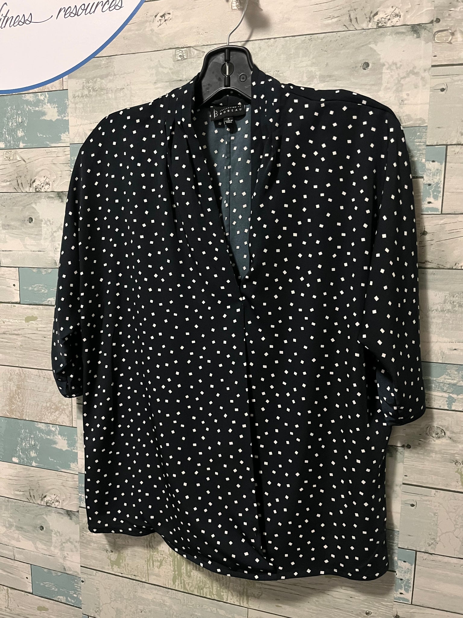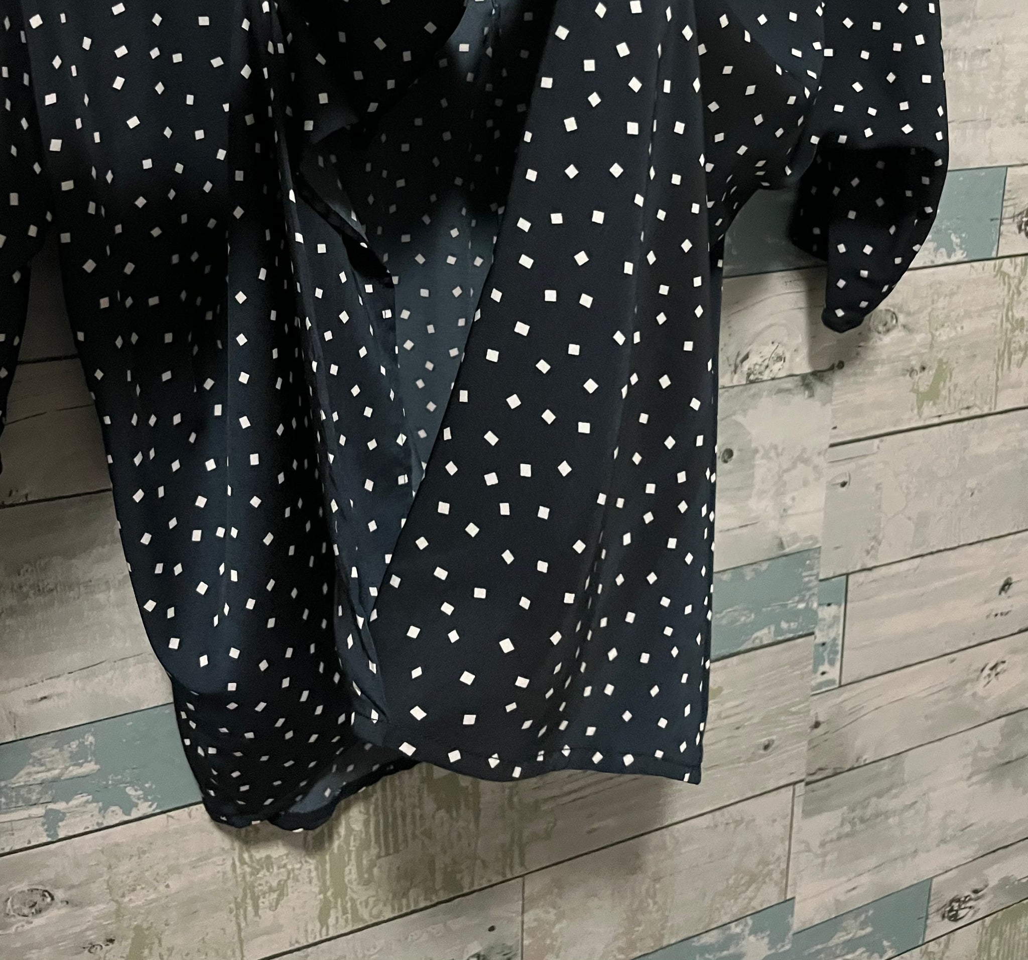 Bobeau B.Collections nursing blouse, navy blue with mini white squares around, pleated collared v-neckline, neckline panels become cross covered panels with midline slit for nursing access, dropped shoulder sleeve with hem above elbows, flowy yet structured blouse, bottom hemline is a 1/4 inch trim.