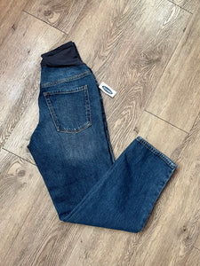 Old Navy maternity denims, medium-wash blue, "boyfriend" style fit, navy blue full panel stretch waist, functional front & back pockets, relaxed tapered fit, Size 2. NWT.